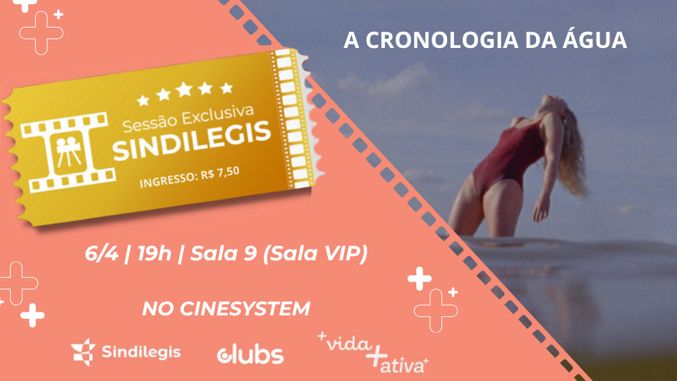 A programação de abril do CineLegis já está confirmada e o filme escolhido é “A Cronologia da Água”. A próxima sessão será realizada na segunda-feira, 6 de abril, às 19h, na Sala 9 (Sala VIP) do Cinesystem – Shopping Casa Park. A partir das 16h desta quarta-feira (1º) os ingressos já estarão disponíveis no Sindilegis Mais.