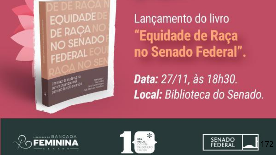 O Senado Federal lança livro Equidade de Raça no Senado Federal no dia 27 de novembro, às 18h30. A obra reúne os principais avanços institucionais na temática.