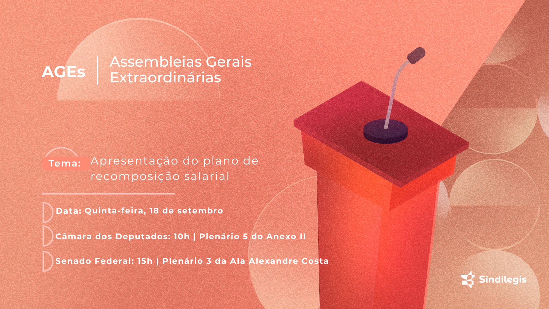 O Sindilegis informa que as Assembleias Gerais Extraordinárias (AGEs) para debater a recomposição salarial das carreiras da Câmara dos Deputados e do Senado Federal estão com nova data: será nesta quinta-feira, 18 de setembro.